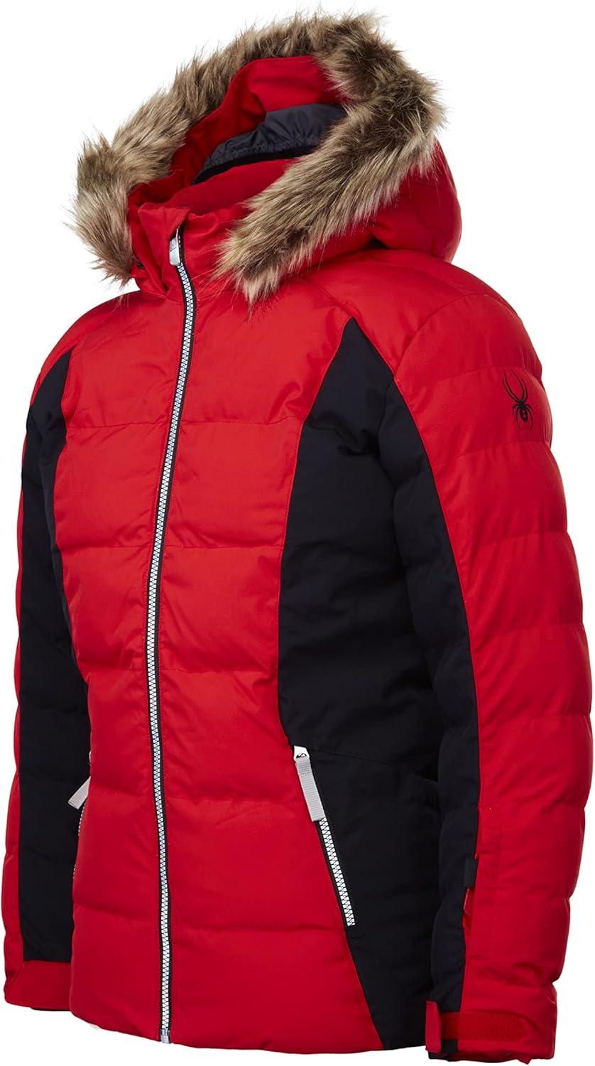 Combining synthetic down insulation with recycled Repreve polyester outer, the Zadie is optimized to keep girls warm and dry when mountain weather moves in and temperatures drop. A 10k/10k laminate with additional DWR creates weatherproof protection and synthetic down traps warmth. A removable hood with detachable faux fur and hologram Vislon zippers are the SPYDER extras that will pop on the podium.
