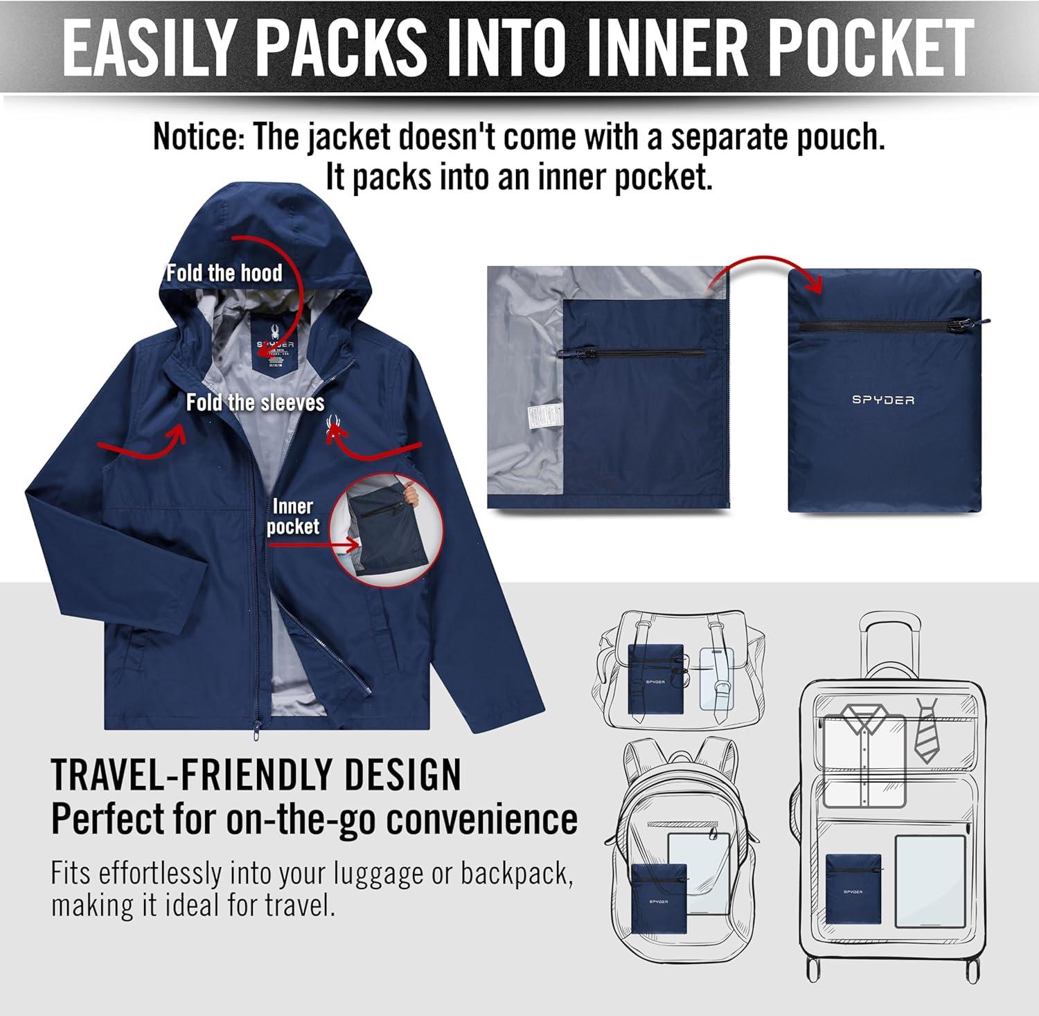 Spyder Packable Rain Jacket Men – Waterproof Windbreaker with Hood, Lightweight Rain Coat Slicker, Travel, Golf, Fishing(Black)